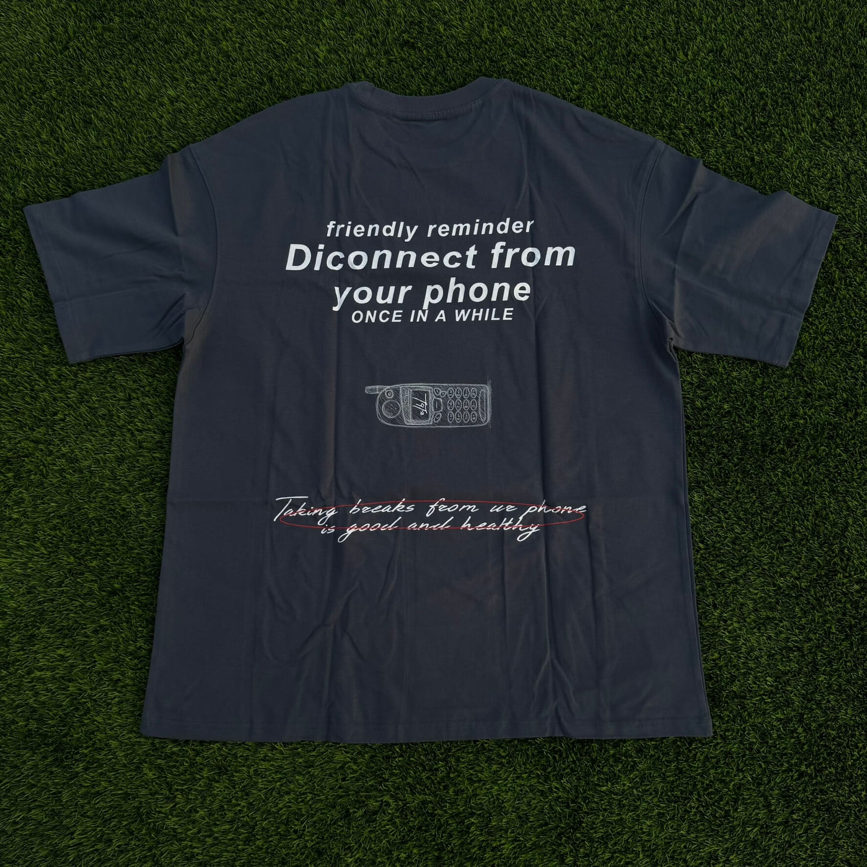 En un mundo en el que las notificaciones nunca se detienen , esta camiseta transmite un mensaje simple pero poderoso: desconéctate de vez en cuando. El diseño presenta una tipografía llamativa que te recuerda a ti (y a todos los demás) que debes alejarte de la pantalla , junto con una corrección humorística tachada que enfatiza la importancia de tomar descansos reales.